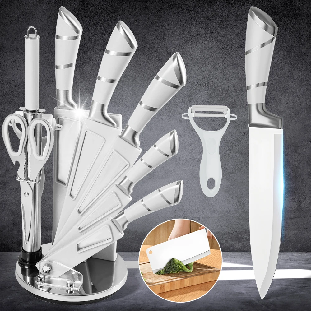 9件套不锈钢空心柄厨房刀具套装,包括切肉刀、烹饪刀、剪刀、面包刀、水果削皮器和刀架