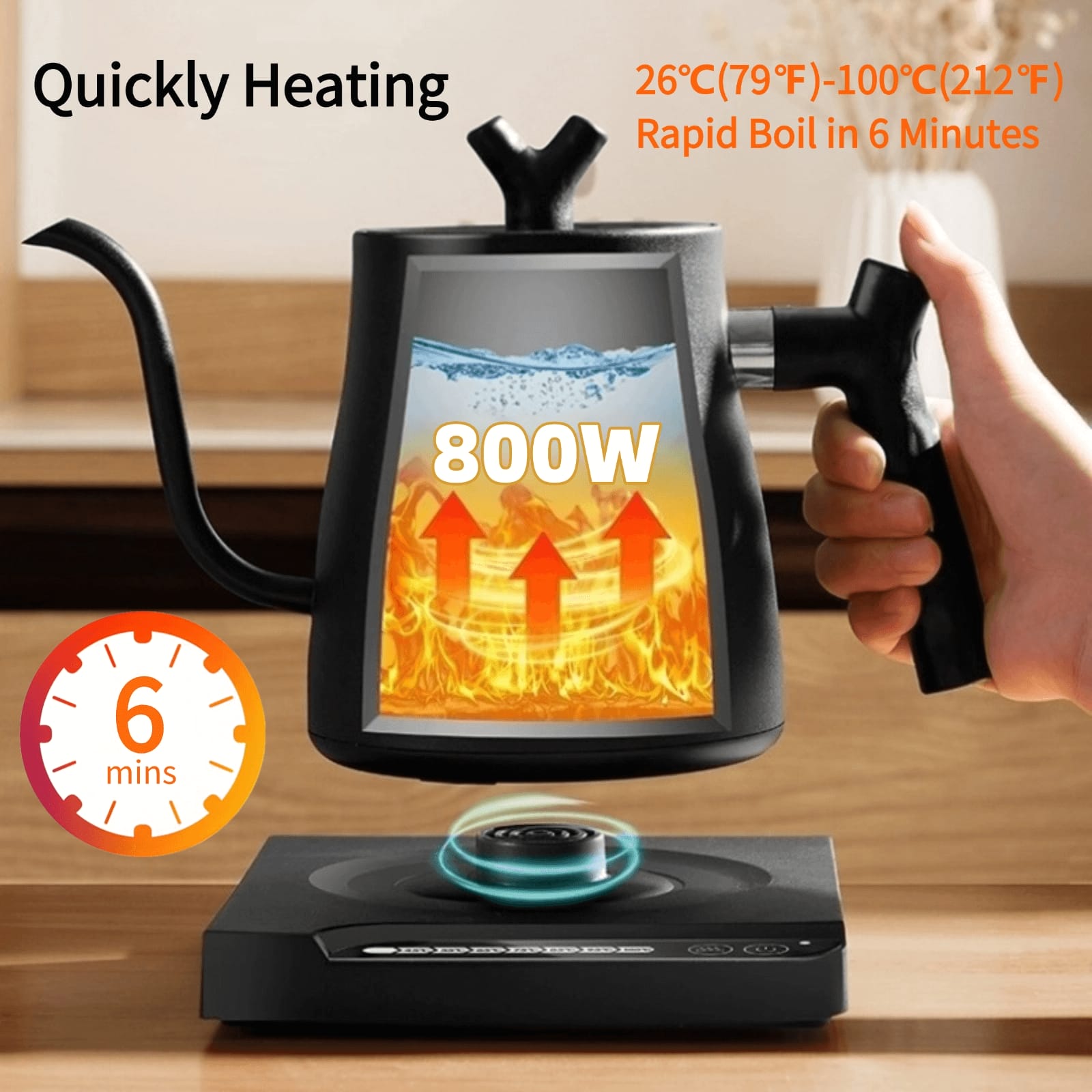 - 【快速加热】800瓦功率,仅需6分钟即可快速加热1升水。水温达到预设温度后,鹅颈壶会自动断电并启动保温功能,非常适合忙碌的早晨或短暂的咖啡小憩