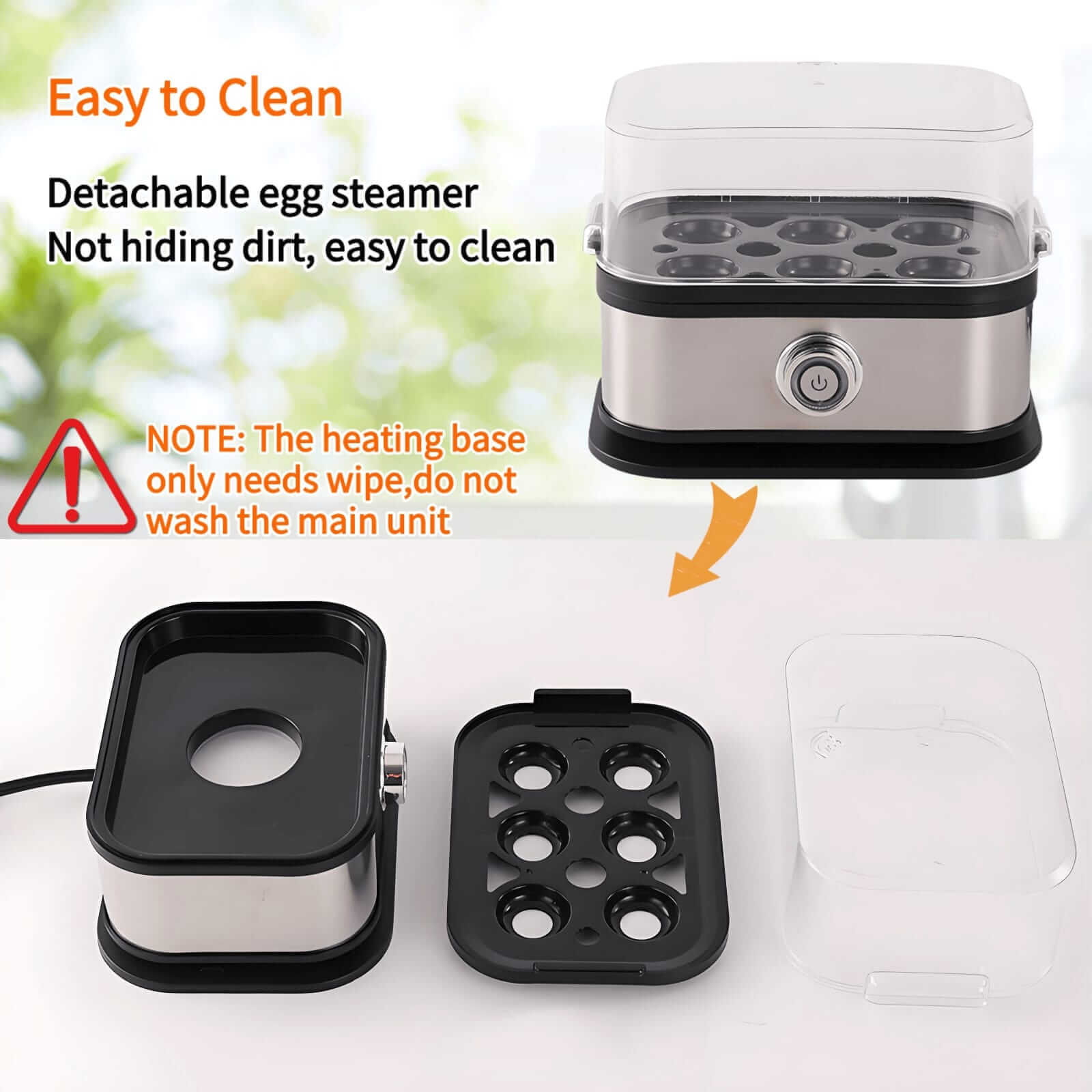 - 【易于清洁】所有部件均可拆卸,并可用洗碗机清洗,方便清洁,包括透明盖、蛋托和加热托盘。注意:加热底座只需快速冲洗擦拭即可,请勿清洗主机